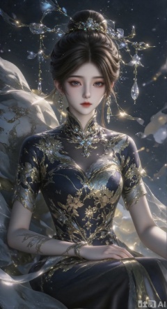 This painting depicts a quiet and elegant scene, in which a young woman is wearing a cheongsam. Her head rested on the stone. Her costume design is complex, featuring exquisite embroidery and light and elegant black fabrics. Her hair is combed into a delicate ball head, and gorgeous Hairpin is used to increase the overall elegance and exquisiteness. The background is soft and fuzzy, and the dreamy black background enhances the quiet atmosphere of the scene, with bright and clearly visible portraits.There is only one Hairpin.