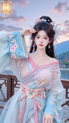 (masterpiece, best quality:1.2),1 girl, solo, long hair, black hair, hair accessories, clothing, cleavage cuts, long dress, jewelry, upper body, earrings. Background is outdoor, sky, clouds, water, trees, architecture, landscape, lantern, mountain, dragon, architecture, bridge, east Asian architecture, fog, pagoda,,(huge breasts:2.99),(full breasts:2.99),XyunxiaoYH3,Xfenlanzhanguopao,XbaifengsongyuYH