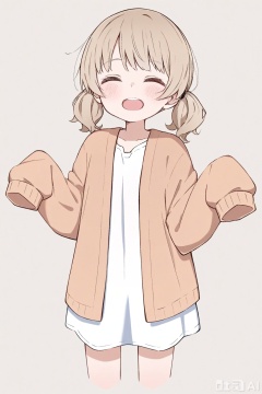 1girl, solo,light brown hair, twintails, blush, smile, shirt, white shirt, long shirt, ^ ^, brown cardigan, cardigan, closed eyes, collarbone, cropped legs, long sleeves, sleeves past fingers, sleeves past wrists, upper teeth only, teeth, white background