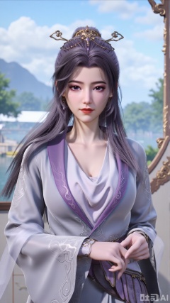(masterpiece, best quality:1.2),1 girl, solo, long hair, black hair, hair accessories, clothing, cleavage cuts, long dress, jewelry, upper body, earrings. Background is outdoor, sky, clouds, water, trees, architecture, landscape, lantern, mountain, dragon, architecture, bridge, east Asian architecture, fog, pagoda,(huge breasts:2.99),(full breasts:2.99),,Xaili2,XyunxiaoYH5,XlinziyueXZ,XtuliH,Xbigbreasts,XMedusaQueen