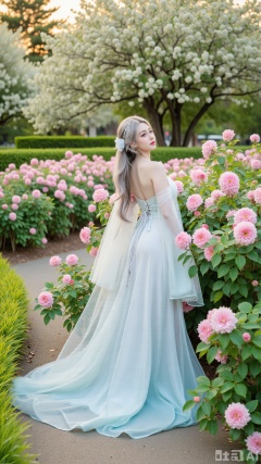 (masterpiece:1.2),best quality,,A woman ,(long dress),A garden filled with pink roses and lush greenery. Soft pastel hues of white,blue,and green,creating a serene atmosphere. Photorealistic photography.,,(huge breasts:2.99),(full breasts:2.99),,XyunxiaoYH3,Xfenlanzhanguopao,XbaifengsongyuYH,Xbigbreasts,XLiquidGlass