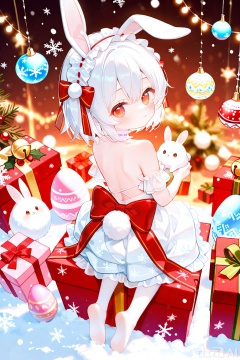loli, 1girl, snow rabbit, red eyes, animal ears, solo, snowflakes, dress, rabbit ears, sitting, white hair, white dress, rabbit, pantyhose, looking at viewer, christmas ornaments, bow, red bow, short hair, holding, white choker, white pantyhose, gift, rabbit tail, looking back, tail, pom pom (clothes), white footwear, box, closed mouth, christmas, ribbon, hairband, red ribbon, hair bow, blush, white hairband, backless dress, animal, rabbit girl, from above, pleated dress, hair ornament, headdress, hair between eyes, backless outfit, from behind, christmas lights, full body, bell, food, easter egg, choker, ballet slippers, frilled hairband, holding animal, shoes, frilled dress, layered dress, gift box, back bow, blurry, easter, frills, snow, fake animal ears, snowflake background, depth of field, bare shoulders, off-shoulder dress, sleeveless dress, pom pom hair ornament, looking up, snowflake print, hair ribbon