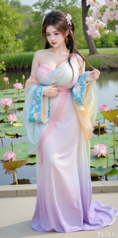 (masterpiece, best quality:1.2),1girl, navel, solo, midriff, bare shoulders, hair ornament,(long hair),(High double ponytail:1.49), red lips, BREAK, (looking at viewer:1.39), chinese clothes,(Holographic Color long dress:1.36), (lace,Rainbow Gradient Color:1.28), BREAK,blurry, solo focus, long hair, lips, daytime, lipstick, outdoors, standing,upper body,(huge breasts:2.89), background, solo, makeup,(Stockings, high heels:1.29),(huge breasts:2.99),(full breasts:2.99),,(Background with lotus pond and pink lotus flowers:1.39),XyunxiaoYH3,Xfenlanzhanguopao,XbaifengsongyuYH,Xbigbreasts,XLiquidGlass