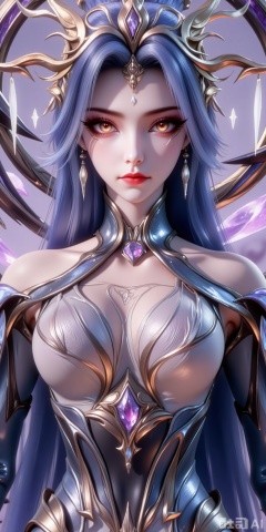 The image depicts a highly detailed and stylized character with a striking appearance. The character has long, flowing blue hair and is adorned with an intricate, metallic headpiece that features ornate, swirling designs. Their eyes are large and expressive, with a vivid orange hue, and they have subtle makeup enhancing their features. The character is wearing a form-fitting, armor-like outfit with a blend of metallic and fabric elements, including a prominent, gem-like centerpiece on the chest. The background is softly blurred, featuring a gradient of purples and blues, which complements the character's ethereal and regal appearance.