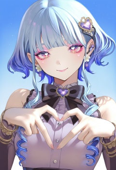 1girl, upper body, heart-shaped pupils, nail polish, sleeveless shirt, choker, medium breasts, shirt, flower earrings, smile, blurry background, gem, gradient eyes, detached sleeves, pink lips, frills, breasts, black bowtie, solo, purple gemstone, blue hair, collarbone, black bow, grey shirt, floral print, makeup, symbol in eye, long sleeves, symbol-shaped pupils, pink nails, pearl hair ornament, white flower, gold bracelet, pink eyeshadow, purple choker, collared shirt, heart hands, ringlets, purple eyes, bowtie, sleeveless, flower \(symbol\), frilled bowtie, blunt bangs, closed mouth, earrings, heart in eye, short hair with long locks, black sleeves, bare shoulders, eyeshadow, headset, eyebrows hidden by hair, looking at viewer, wing collar, blurry foreground, blue background, hair ornament, multicolored eyes, heart hands duo, jewelry,masterpiece, best quality