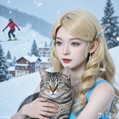 A close-up of a realistic and surreal portrait of Juck Zhang, featuring a girl with long, curly blonde hair and blue eyes holding a cat. She sits with her hair slightly tousled, with water droplets glistening on her locks. Her gaze is fixed on a small snow-covered village and ski resort, surrounded by pine trees and a skier gliding through the scene. The composition is illuminated by natural light, enhancing the dreamy, magical realism. Soft, fuzzy snowfall creates a quiet winter atmosphere. The image is captured in ultra-detail and ultra-high resolution, with Fuji color film aesthetics, using an 85mm f/1.4 lens. The girl's exquisite face, lips, eyes, and nose, along with her hair accessories, jewelry, and bare shoulders, create a stunning, story-rich micro-world.