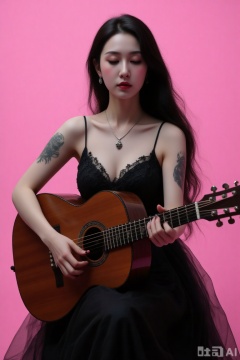 1girl, instrument, black hair, long hair, solo, tattoo, dress, jewelry, necklace, guitar, closed eyes, black dress, nail polish, very long hair, pink background, blush, music, pale skin, playing instrument, barefoot, makeup