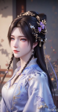 1girl, solo, long hair, blue eyes, brown hair, hair ornament, long sleeves, dress, jewelry, upper body, braid, flower, earrings, outdoors, hair flower, necklace, blurry, looking to the side, blurry background, blue dress, shadow, chinese clothes, realistic,