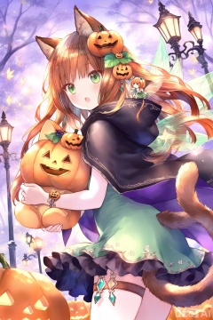 1girl, :o, animal_ears, brown_eyes, cat_ears, cat_girl, cat_tail, cloak, commentary_request, copyright_notice, cowboy_shot, cygames, dress, fairy, fairy_wings, food-themed_hair_ornament, frilled_skirt, frills, from_behind, green_dress, green_eyes, hair_ornament, highres, holding, holding_stuffed_toy, jack-o'-lantern, jewelry, lamppost, long_hair, looking_at_viewer, looking_back, official_art, open_mouth, pumpkin_hair_ornament, shingeki_no_bahamut, skirt, strapless, strapless_dress, stuffed_toy, tail, thigh_strap, tree, wings