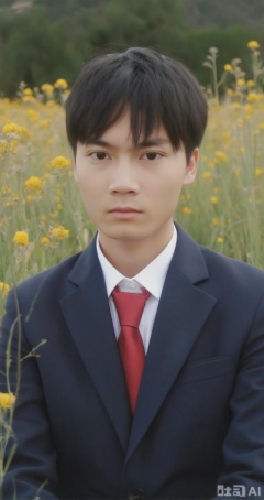 a boy,necktie,male focus,solo,black hair,shirt,formal,flower,looking at viewer,red necktie,realistic,white shirt,suit,jacket,yellow flower,outdoors,field,collared shirt,upper body,blue jacket,short hair,grass,blurry,long sleeves,belt,, best quality,High Quality,realistic,RAW photo,masterpiece,8k,insane details,High detail,hyperdetailed,