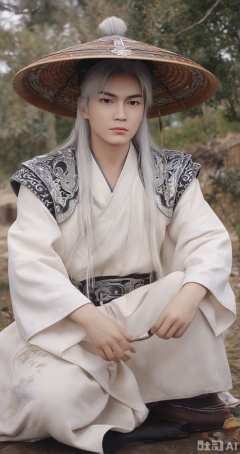 The image is a digital illustration of a young man wearing a traditional Chinese outfit. He is sitting on the ground with his legs crossed and his hands resting on his knees. The outfit is white with intricate black and silver designs on the shoulders and sleeves. The man has long white hair and is wearing a large, wide-brimmed hat with a pom-pom on top. He has a serious expression on his face and is looking directly at the camera. The background is blurred, but it appears to be a wooded area with trees and bushes. The overall mood of the image is peaceful and serene.