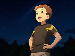 <lora:LH_Tohya_XL:1>,Tohya,best quality,best detail,masterpiece,outdoors,night,nature,male focus,solo,1boy,(child:1.2),very short hair,brown hair,brown eyes,(vertical pupil:1.7),hands on own hips,looking up at the stars,:d,black shirt,shorts,(5fingers,perfect hands:1.6),correct anatomy,available light,