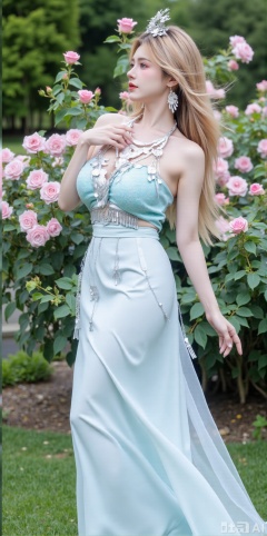 (masterpiece:1.2),best quality,,A woman ,(long dress),A garden filled with pink roses and lush greenery. Soft pastel hues of white,blue,and green,creating a serene atmosphere. Photorealistic photography.,,(huge breasts:2.99),(full breasts:2.99),XyunxiaoYH3,Xfenlanzhanguopao,XbaifengsongyuYH,Xbigbreasts,XLiquidGlass,XnanxiaochengYH,Xmiaozufushi