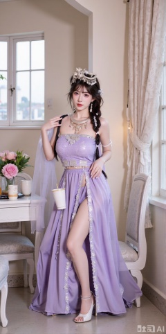 (masterpiece:1.2),Ultra clear, 8k, 1girl, solo, long hair, looking at viewer, bangs,long dress,, bare shoulders, jewelry, black hair, standing, purple eyes, full body, flower, thighs, indoors, hair bun, long dress, high heels, cup, see-through, book, bare legs, window, table, white footwear, standing on one leg, curtains, pink flower, side slit, vase, ,(huge breasts:2.99),(full breasts:2.99),,XyunxiaoYH3,Xfenlanzhanguopao,XbaifengsongyuYH,Xbigbreasts,XLiquidGlass,XnanxiaochengYH,Xmiaozufushi
