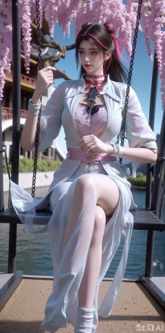 (masterpiece, top quality, best quality, official art, beautiful and aesthetic:1.2),Dynamic posture,(Sitting on the swing:1.39),natural skin texture,(Milky skin:1.2),1gir,solo,long Dress, (Long legs, perfect proportions:1.2),(Sakura, butterfly:1.29),(huge breasts:2.99),(full breasts:2.99),Wisteria, wisteria flowers, castle, waterfall, mountains in the distance,,XyunxiaoYH3,Xfenlanzhanguopao,XbaifengsongyuYH,Xbigbreasts,XLiquidGlass,XnanxiaochengYH,Xmiaozufushi