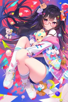 masterpiece,best quality,high quality,(colorful),1girl, solo, long hair, shirt, black hair, hair ornament, long sleeves, holding, very long hair, jacket, full body, heart, food, shoes, glasses, shorts, socks, hood, two side up, kneehighs, hoodie, floating hair, stuffed toy, white footwear, stuffed animal, white socks, sneakers, candy, bandaid, red-framed eyewear, teddy bear, envelope, paper airplane