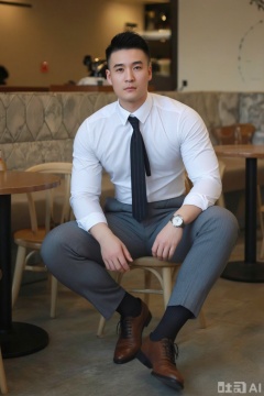 xnz,shx,jzns,1man,solo,realistic,male focus,wristwatch, sitting, grey suit,grey pants,black necktie,white shirt,  footwear,black sheer socks, vertical strips socks,brown footwear,cafe, looking at viewer,masterpiece, realistic, best quality, highly detailed,profession,aoinll