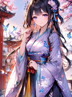 Hanfu,O,1girl,weapon,japanese clothes,solo,long hair,butterfly,purple eyes,sword,kimono,***,black hair,looking at viewer,sash,jewelry,obi,earrings,floral print,long sleeves,katana,bangs,purple kimono,cowboy shot,wide sleeves,breasts,sheath,holding,tassel,closed mouth,outdoors,sheathed,standing,flower,petals,very long hair,medium breasts,sky,blue butterfly,print kimono,holding weapon,