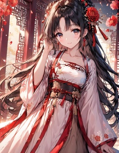 Hanfu,O,1girl, long hair, petals, solo, hair ornament, flower, hair flower, jewelry, earrings, dress, long sleeves, hanfu, wide sleeves, chinese clothes, lattice, architecture, looking at viewer, black hair, smile, sash, indoors, white dress, holding, window, very long hair, red eyes, standing, falling petals, red flower, closed mouth, day, tassel, bangs, collarbone, floating hair, shawl, rose, east asian architecture, ribbon, hand up, small breasts, brown eyes, breasts, red ribbon, parted bangs