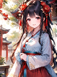 Hanfu,O,1girl, solo, black hair, hair ornament, long hair, looking at viewer, flower, smile, hair flower, long sleeves, outdoors, skirt, tassel, red skirt, tree, bangs, shirt, parted bangs, white shirt, open mouth, cowboy shot, chinese clothes, blush, standing, red flower, day