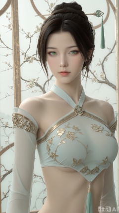score_9,score_8, 1woman, ornament, solo, 2 green tassel triangle dudou, Glossy exquisite skin, even illumination, looking at viewer, upper_body, very awa, Solid_translucent background