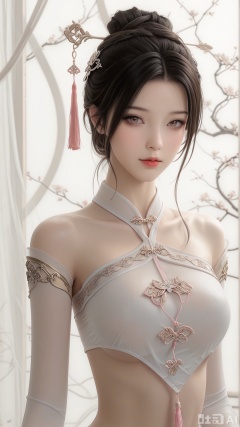 1woman, ornament, solo, pink tassel triangle dudou, Glossy exquisite skin, even illumination, looking at viewer, very awa, Solid_translucent background