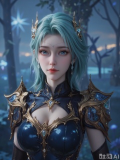 Anime-style,Photograph of a fantasy scene featuring a beautiful woman with teal hair and pale skin. She is adorned in elaborate, dark blue and gold armor with intricate designs. Her armor includes a high collar and shoulder guards. She has a delicate, ethereal expression and a small, golden pendant at her collar. The background is a mystical, ethereal forest with glowing blue crystals. The lighting is soft and magical, enhancing the fantasy atmosphere. The image has a high-quality, cinematic feel, likely from a video game or a fantasy film. The style is realistic with a touch of fantasy art.,zichu-BD