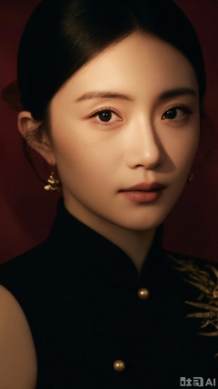 plns,xzs, An oriental woman in a black cheongsam with golden bamboo patterns, dark red background. Close - up, light and shadow highlight facial contours. Retro and rich tone, showing classical charm.