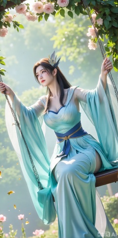 (masterpiece, best quality:1.2),In a cinematic shot with soft sunlight filtering through petals, a delicate fairy-like beauty swings gently on a flower swing amidst a whimsical garden. She wears a pale blue hanfu with flowing wide sleeves and a translucent silk sash tied around her slender figure. Her long black hair with blue highlights cascades down her back, adorned with a pearl hairpin. A gentle smile plays on her innocent eyes as she floats above the flowers, surrounded by fluttering butterflies and golden pollen particles. Magical runes float in the air, casting an ethereal glow. Vines wrap around the ropes of the swing, intertwined with roses and morning glories. The pastel color palette and fantasy atmosphere evoke a sense of wonder and enchantment.,(huge breasts:2.99),(full breasts:2.99),XyunxiaoYH3,Xfenlanzhanguopao,XbaifengsongyuYH,Xbigbreasts,XLiquidGlass,XnanxiaochengYH,Xmiaozufushi,Xkejinnudi,Xbiji