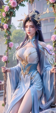 (masterpiece, best quality:1.2),In a cinematic shot with soft sunlight filtering through petals, a delicate fairy-like beauty swings gently on a flower swing amidst a whimsical garden. She wears a pale blue hanfu with flowing wide sleeves and a translucent silk sash tied around her slender figure. Her long black hair with blue highlights cascades down her back, adorned with a pearl hairpin. A gentle smile plays on her innocent eyes as she floats above the flowers, surrounded by fluttering butterflies and golden pollen particles. Magical runes float in the air, casting an ethereal glow. Vines wrap around the ropes of the swing, intertwined with roses and morning glories. The pastel color palette and fantasy atmosphere evoke a sense of wonder and enchantment.,(huge breasts:2.99),(full breasts:2.99),XyunxiaoYH3,Xfenlanzhanguopao,XbaifengsongyuYH,Xbigbreasts,XLiquidGlass,XnanxiaochengYH,Xmiaozufushi,Xkejinnudi,Xbiji
