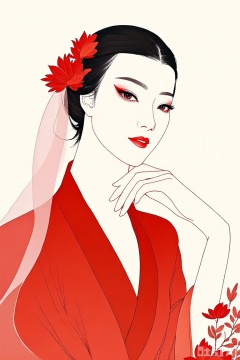 The image depicts a woman dressed in a flowing red garment, reminiscent of traditional East Asian attire. She is adorned with a striking red flower in her hair, and her makeup is bold, with prominent red lipstick and defined eyeliner. Her expression is serene, and she is resting her chin on her hand, exuding a sense of calm and elegance. The background is minimalistic, with subtle floral elements in the lower right corner, complementing the overall aesthetic.