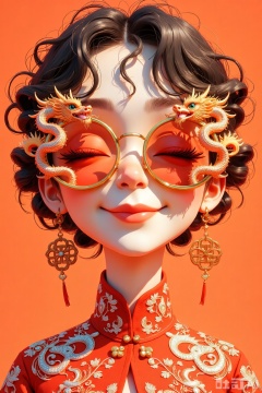 The image depicts a stylized, digitally rendered character with a serene expression. The character is wearing a traditional Chinese outfit adorned with intricate dragon embroidery, which is predominantly red. The character also has large, round sunglasses with dragon motifs, adding a whimsical and artistic touch. The background is a solid, vibrant orange, which complements the character's attire and enhances the overall warm and festive atmosphere. The character's hair is styled in soft curls, and the earrings are long and ornate, featuring traditional Chinese knot designs. The image exudes a blend of cultural heritage and modern artistic expression.