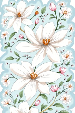 The image features a beautifully designed floral pattern with large white flowers prominently displayed. These flowers have intricate petals and a central orange-pink pistil, surrounded by smaller pink flowers and delicate green leaves. The background consists of swirling, fluid blue patterns that create a sense of movement and depth. The overall composition is harmonious, with the flowers and leaves creating a balanced and aesthetically pleasing arrangement.