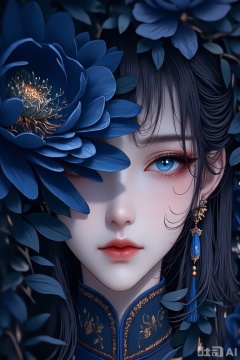 The image depicts a close-up of a person adorned in traditional attire, featuring intricate blue and gold embroidery on their clothing. The individual has long black hair, styled with delicate strands, and is wearing elaborate earrings that match the ornate design of their outfit. A striking feature is the large blue flower that partially covers the person's face, blending seamlessly with their skin and adding a surreal, ethereal quality to the composition. The background is filled with more blue flowers, creating a cohesive and harmonious aesthetic.