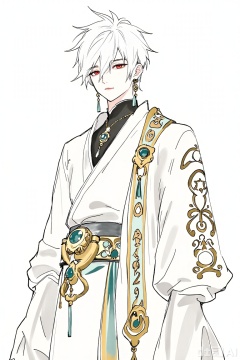 The image depicts a character with short, spiky white hair and red eyes. The character is dressed in an elaborate outfit that includes a white robe with intricate gold and green designs, a black inner garment, and a wide belt with a large central gemstone. The character is also wearing large dangling earrings and a necklace with a green and blue pendant. The background is plain white, emphasizing the character's attire and features.