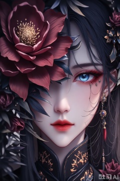 The image depicts a close-up of a person adorned in traditional attire, featuring intricate designs and embellishments. The individual has striking blue eyes, highlighted with red eyeshadow, and their lips are painted a vivid red. A large, ornate flower is partially covering their face, adding an ethereal and mystical element to the composition. The person is wearing elaborate earrings and a decorative headpiece, which complements the overall aesthetic. The background is softly blurred, emphasizing the detailed and vivid features of the person in the foreground.