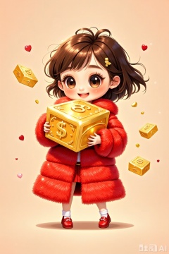 The image depicts a young girl with brown hair and large, expressive eyes, wearing a red furry coat and red shoes. She is holding a large golden ingot in her hands, and there are several smaller golden ingots floating around her. The background is a light beige color, and the overall scene has a cheerful and festive atmosphere.