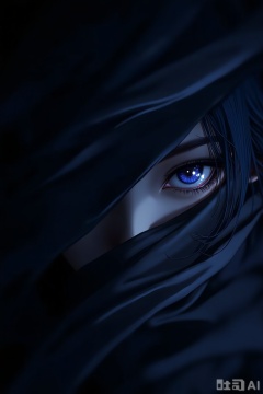 The image depicts a close-up of a character with striking blue eyes, partially covered by a dark fabric. The character's hair is also visible, with strands of blue hair framing the face. The background is dark, creating a contrast that highlights the character's eyes, which are glowing with a soft, ethereal light. The overall atmosphere is mysterious and slightly eerie, with the fabric adding an element of concealment.