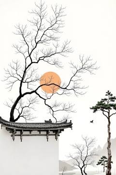 The image depicts a serene scene with a traditional East Asian architectural structure, likely a temple or pavilion, characterized by its curved roof and intricate carvings. The structure is partially obscured by a leafless tree with intricate branches, which frames the upper part of the image. A large, orange circle resembling the setting or rising sun is visible through the tree's branches, creating a striking contrast against the pale sky. A bird is captured mid-flight near the right side of the image, adding a sense of movement and life to the otherwise still scene. The background consists of more trees, with one prominent pine tree visible on the right side, contributing to the tranquil and natural atmosphere.