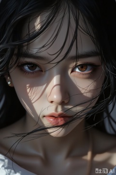 The image depicts a close-up of a young person with long, dark hair partially covering their face. The person's eyes are large and expressive, with light-colored irises and long eyelashes. The skin appears smooth and is illuminated by natural light, creating soft shadows on the face. The background is out of focus, emphasizing the subject's face and hair. The overall atmosphere is serene and slightly mysterious, with a focus on the delicate details of the person's features.