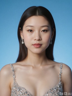 1girl, cleavage,hug breasts,Breast lateral leakage,earrings, solo, Low cut evening gown,jewelry, blue_background, realistic, upper_body, sleeveless, lips, long_hair, brown_eyes, big breasts, evening dress, looking_at_viewer, nose, black_hair,