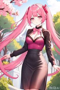 1girl, solo, long hair, breasts, looking at viewer, bangs, long sleeves, bow, cleavage, twintails, medium breasts, very long hair, closed mouth, pink hair, outdoors, alternate costume, bowtie, pink eyes, tree, pink bow, hilda valentine goneril