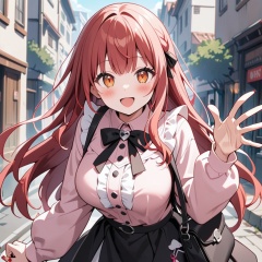 1girl, solo, virtual youtuber, skirt, red hair, bag, long hair, smile, outdoors, open mouth, looking at viewer, jirai kei, pink shirt, long sleeves, handbag, breasts, black skirt, shirt, orange eyes, waving, bangs, ****, building, :d, blush, black ribbon, large breasts, cowboy shot, nail polish, frills, day, ribbon