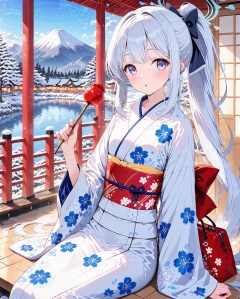 Miyako (blue archive),O,Five fingers,Miyako (blue archive),1girl,japanese clothes,halo,kimono,solo,food,long hair,white hair,looking at viewer,floral print,sash,sitting,obi,purple eyes,hair ornament,flower,ponytail,hair flower,white kimono,very long hair,holding,bangs,outdoors,snow,mountain,print kimono,hair bow,bag,long sleeves,parted lips,wide sleeves,bow,candy apple,sidelocks,holding food,blush,yukata,(UHD),anatomically correct,accurate,textured skin,super detail,high details,award winning,best quality,high quality,retina,HD,16k,1080P,