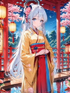 Miyako (blue archive),O,Hanfu,Miyako (blue archive), Hanfu, cross collar, waist-length blouse, ice blue, moon white, cherry blossom pattern, star and moon pattern, silver thread sash, jade pendant tassel, white jade waistband, long black hair, white jade hairpin, crystal earrings, standing posture, full body, looking straight ahead, hands folded, wide sleeves hanging down, pond, wooden boardwalk, spring water, water lilies, koi fish, ripples, reflection, pink cherry blossom tree, lantern, warm light, spring breeze, line drawing, 8K, full body, (UHD), anatomically correct, accurate, textured skin, super detail, high details, award winning, best quality, high quality, retina, HD, 16k, 1080P