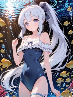 Miyako (blue archive),O,Five fingers,Miyako (blue archive),1girl, purple eyes, swimsuit, underwater, ponytail, one-piece swimsuit, long hair, looking at viewer, white hair, halo, hair bow, solo, bow, bubble, bangs, fish, sandals, breasts, sidelocks, air bubble, toes, blue one-piece swimsuit, frills,(UHD),anatomically correct,accurate,textured skin,super detail,high details,award winning,best quality,high quality,retina,HD,16k,1080P,