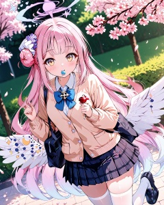 mika (blue archive),O,1girl, mika (blue archive), solo, thighhighs, long hair, halo, white thighhighs, pink hair, food, bag, school uniform, skirt, single side bun, cherry blossoms, yellow eyes, hair ornament, food in mouth, hair bun, looking at viewer, bow, mouth hold, petals, blush, cardigan, bangs, school bag, very long hair, flower, black footwear, hair flower, shoes, shirt, long sleeves, plaid, plaid skirt, falling petals, bowtie, candy, wings, lollipop, blue bow, standing, standing on one leg, black bag, zettai ryouiki, pleated skirt, white shirt, button badge, loafers, leg up, angel wings,(UHD),anatomically correct,accurate,textured skin,super detail,high details,award winning,best quality,high quality,retinal,HD,16k,1080P,