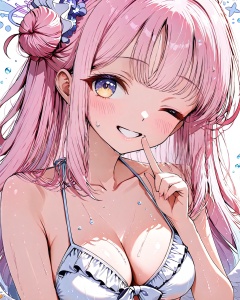 mika (blue archive),O,1girl,swimsuit,one eye closed,bikini,breasts,wings,solo,halo,navel,long hair,smile,yellow eyes,looking at viewer,frills,mika (blue archive),frilled bikini,finger to mouth,blush,cleavage,white bikini,low wings,bangs,angel wings,pink hair,medium breasts,white wings,large breasts,feathered wings,wet,shushing,water drop,grin,purple eyes,(UHD),anatomically correct,accurate,textured skin,super detail,high details,award winning,best quality,high quality,retinal,HD,16k,1080P,