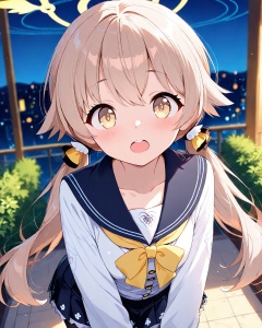 O,ultra detailed anime texture,1girl, hifumi (blue archive), solo, twintails, pantyhose, skirt, halo, school uniform, looking at viewer, long hair, black pantyhose, low twintails, open mouth, yellow eyes, blush, night, blurry, blurry background, hair between eyes, sailor collar, long sleeves, pleated skirt, bangs, outdoors, upper teeth only, light brown hair, hair ornament, teeth, bag, serafuku,(UHD),anatomically correct,accurate,textured skin,super detail,high details,award winning,best quality,high quality,retinal,HD,16k,1080P,