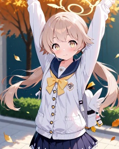 O,ultra detailed anime texture,1girl, hifumi (blue archive), solo, bag, twintails, backpack, looking at viewer, skirt, halo, yellow eyes, long hair, long sleeves, school uniform, sailor collar, leaf, bangs, low twintails, blue skirt, blurry, falling leaves, light brown hair, white cardigan, pleated skirt, stretching, blush, sleeves past wrists, serafuku, wind, cardigan, bow, white bag, blurry background,(UHD),anatomically correct,accurate,textured skin,super detail,high details,award winning,best quality,high quality,retinal,HD,16k,1080P,